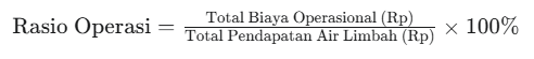 Definisi: Rasio yang mengukur tingkat efisiensi perusahaan dalam mengendalikan biaya operasional dibandingkan dengan pendapatan air limbah. Semakin rendah rasio, semakin efisien. Rasio di atas 100% menunjukkan kerugian operasional. Biaya penyusutan tidak termasuk dalam perhitungan biaya operasional.
