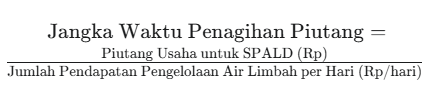 Definisi: Rasio yang mengukur persentase tagihan air limbah yang berhasil diterima pembayarannya dari pelanggan. Semakin tinggi rasio, semakin efektif penagihan dan semakin kecil piutang usaha.