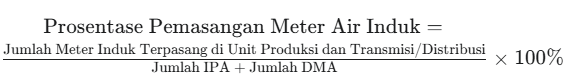 Definisi: Persentase jumlah meter air induk yang terpasang dan berfungsi di unit produksi (IPA/Reservoidan transmisi/distribusi (DMterhadap total jumlah IPA dan DMA.