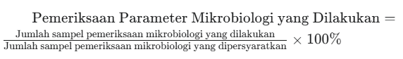 Definisi: Persentase jumlah sampel pemeriksaan mikrobiologi yang dilakukan di titik pelanggan dibandingkan dengan jumlah sampel pemeriksaan mikrobiologi yang dipersyaratkan sesuai Permenkes Nomor 002/MENKES/PER/I/2023.