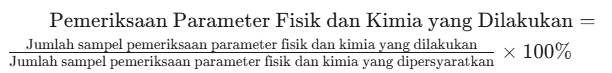 Definisi: Persentase jumlah sampel pemeriksaan parameter fisik dan kimia yang dilakukan di titik pelanggan dibandingkan dengan jumlah sampel pemeriksaan parameter fisik dan kimia yang dipersyaratkan sesuai Permenkes Nomor 002/MENKES/PER/I/2023.