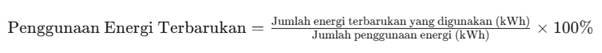 Definisi: Persentase energi yang digunakan dari sumber terbarukan (tenaga surya, angin, air, biologi, dan panas bumi yang diusahakan sendirterhadap total penggunaan energi BUMD-AM.