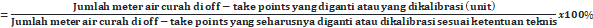 Definisi: Persentase jumlah meter air curah di titik serah yang telah diganti atau dikalibrasi dibandingkan dengan jumlah yang seharusnya diganti atau dikalibrasi sesuai ketentuan teknis. Indikator ini mengukur tingkat akurasi meter air curah.
