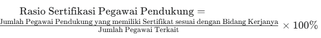 Rasio Sertifikasi Pegawai Pendukung= Jumlah Pegawai Pendukung yang memiliki Sertifikat sesuai dengan Bidang Kerjanya/Jumlah Pegawai Terkait×100%