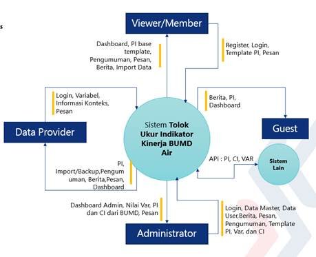 Berdasarkan gambar 1 di bawah ini, sistem Tolok Ukur Indikator Kinerja BUMD Air memiliki ruang lingkup fungsional yang mencakup berdasarkan  jenis pengguna. Berikut adalah penjelasan mengenai ruang lingkup sistem tolok ukur ini berdasarkan jenis pengguna.